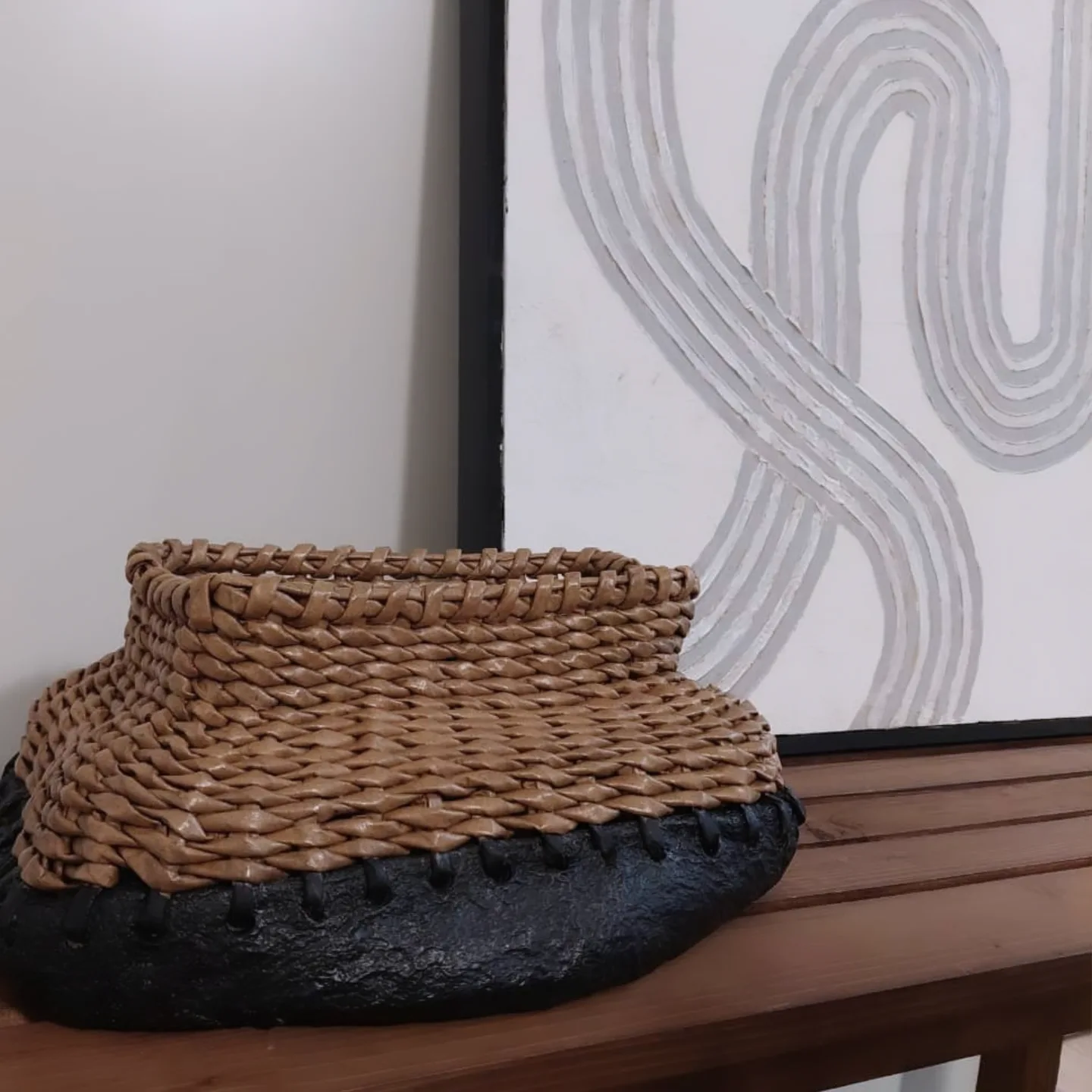 گلدان تلفیقی سفال و ویکر بافی گرد توپی